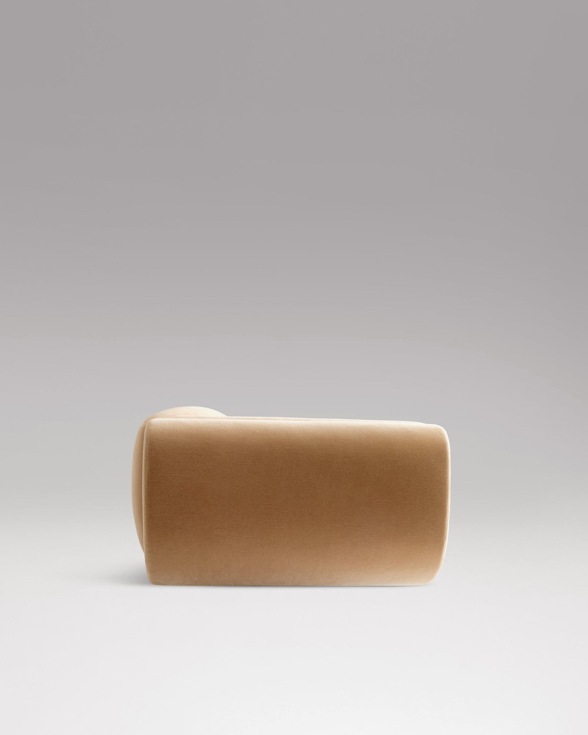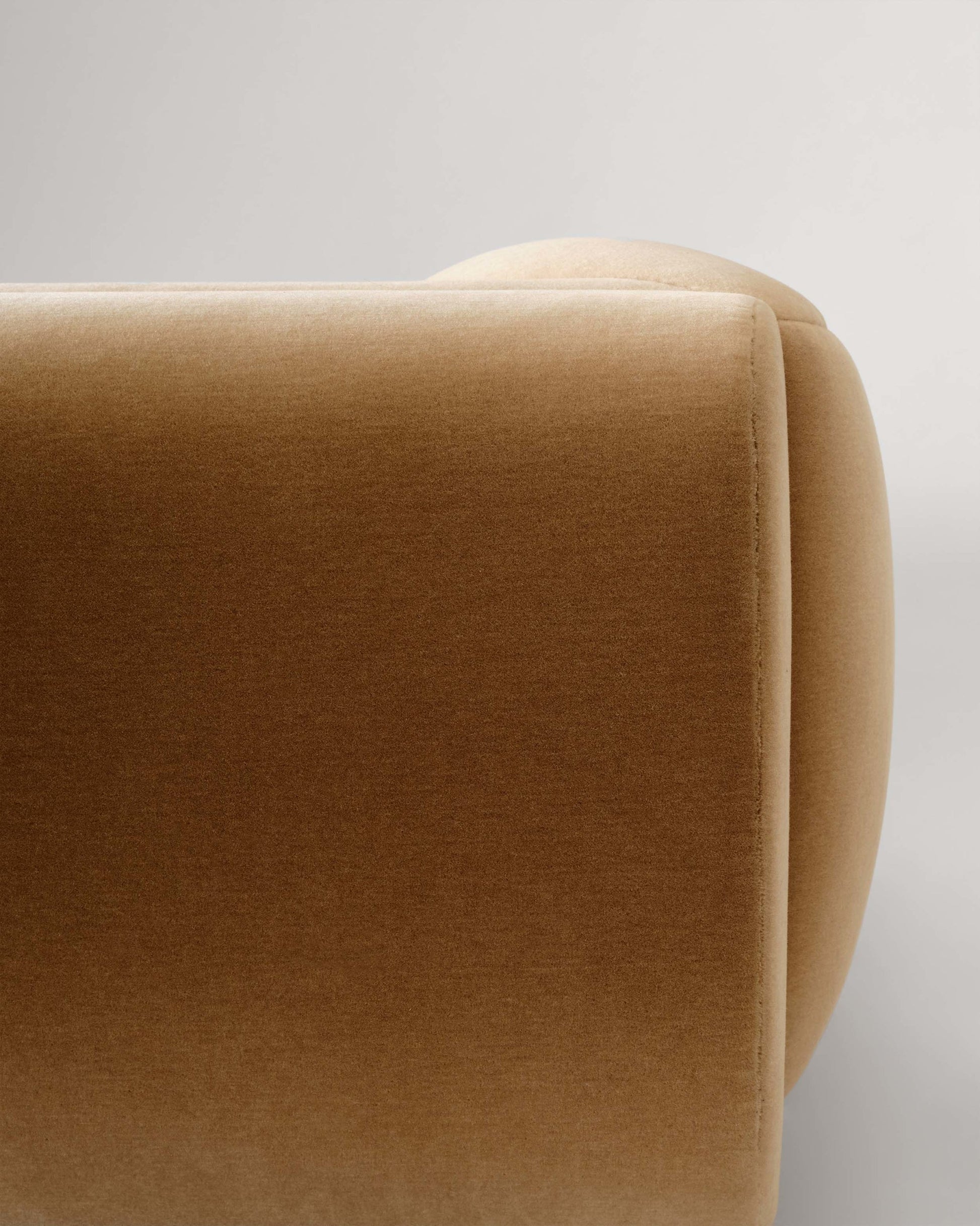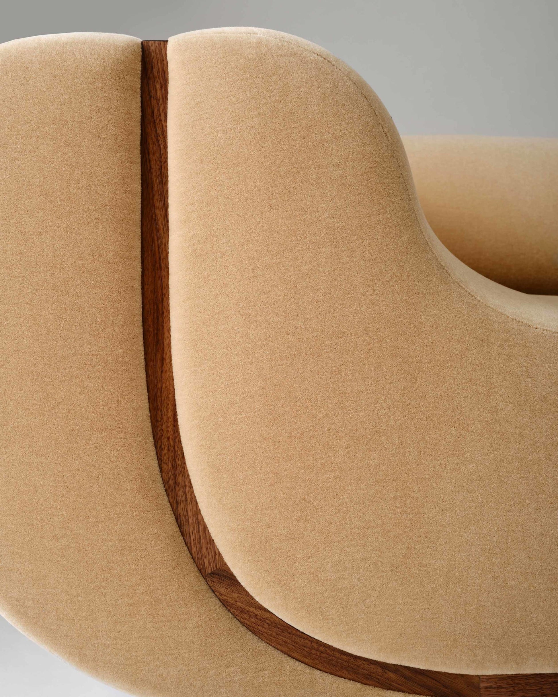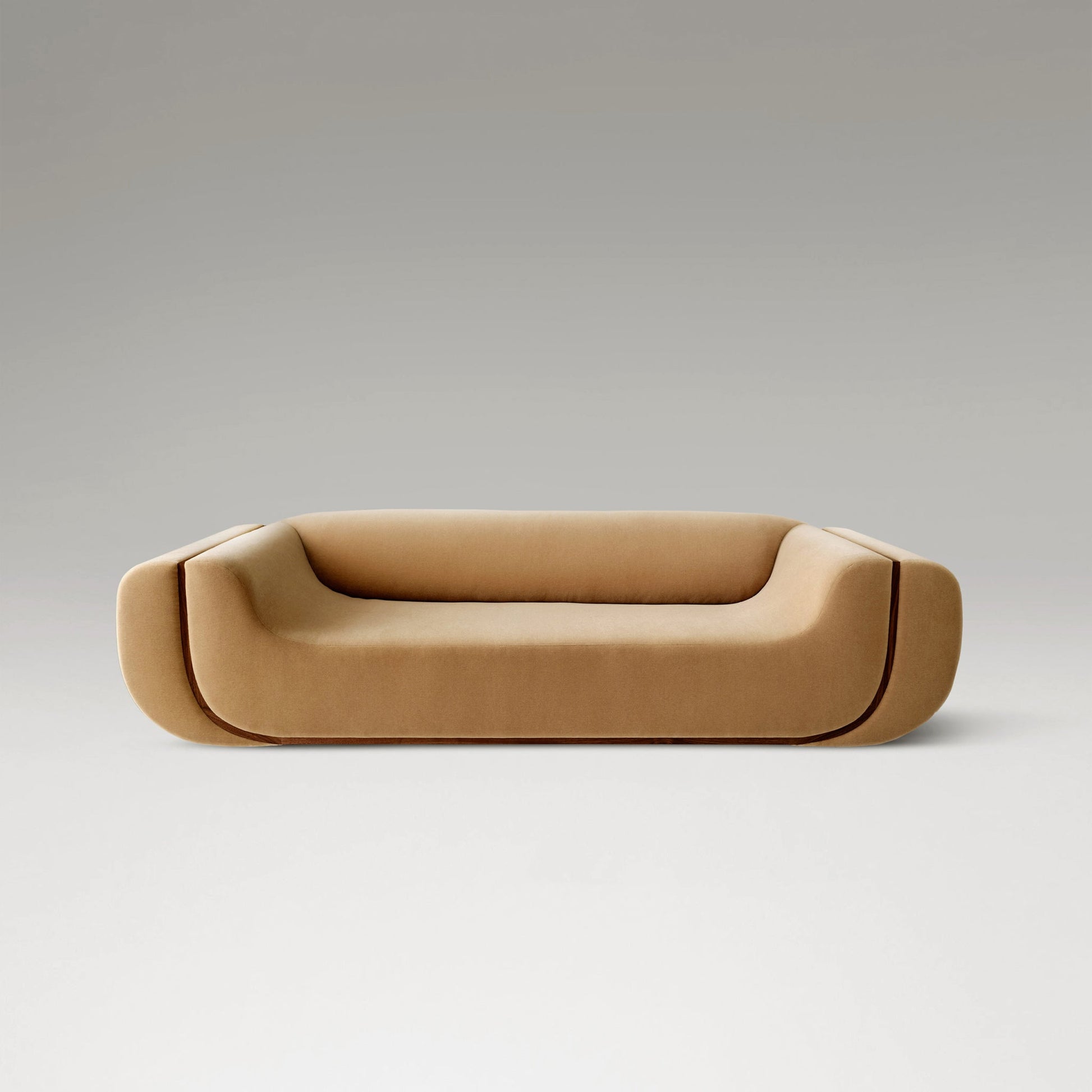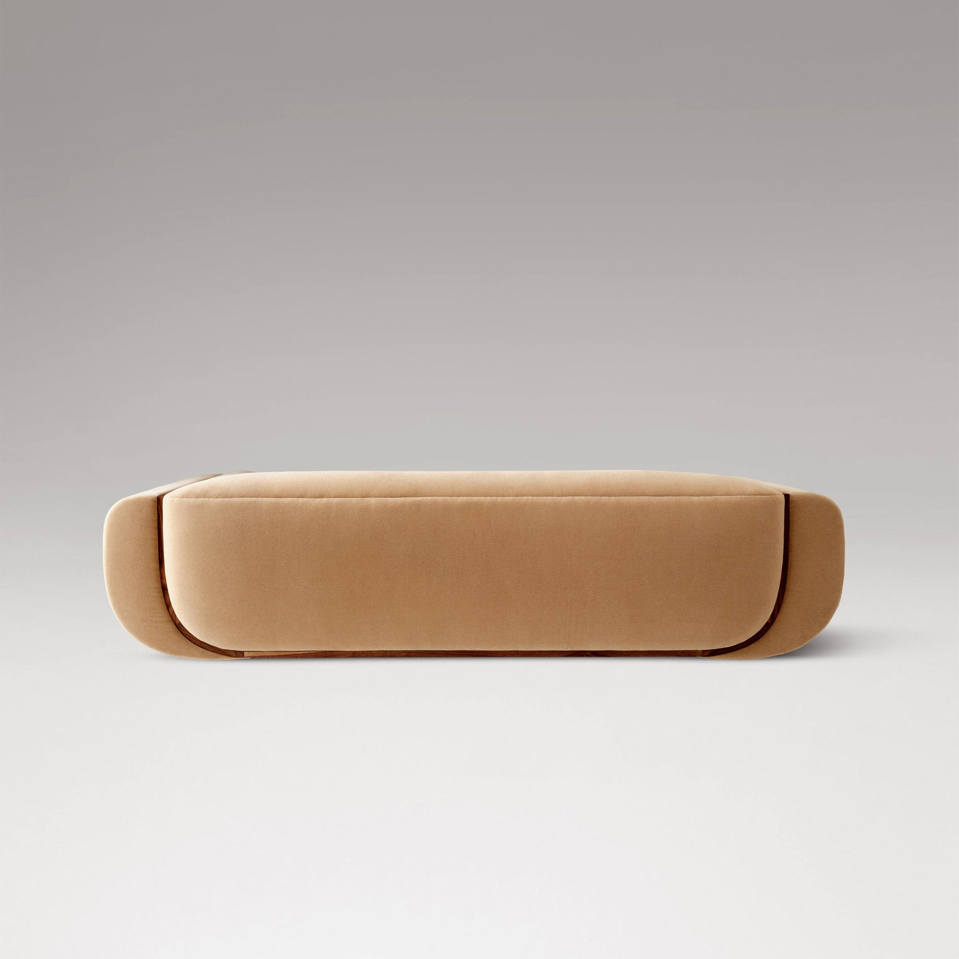 Stunning upholstered sofa made by curving walnut inlay wraps around an upholstered frame.