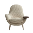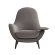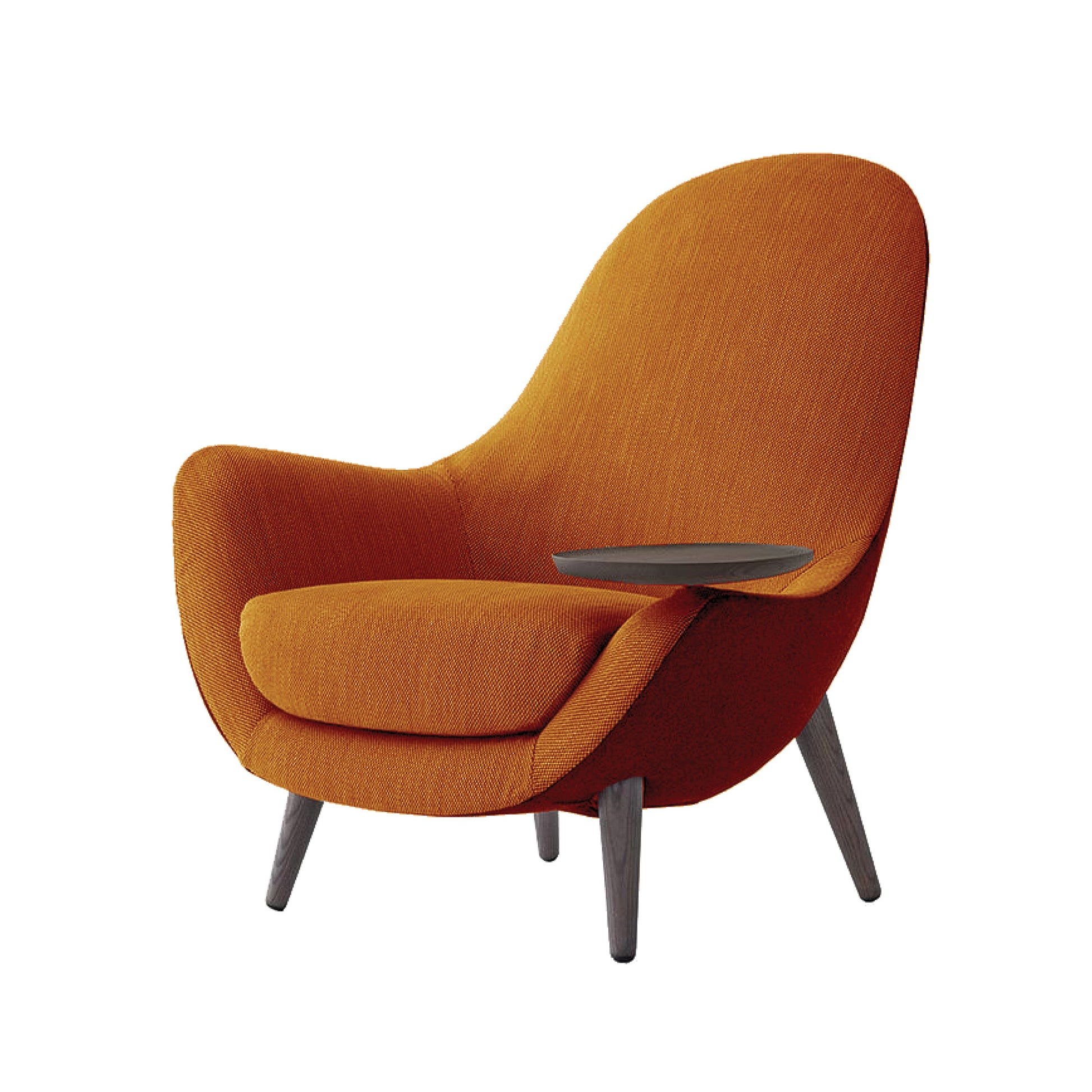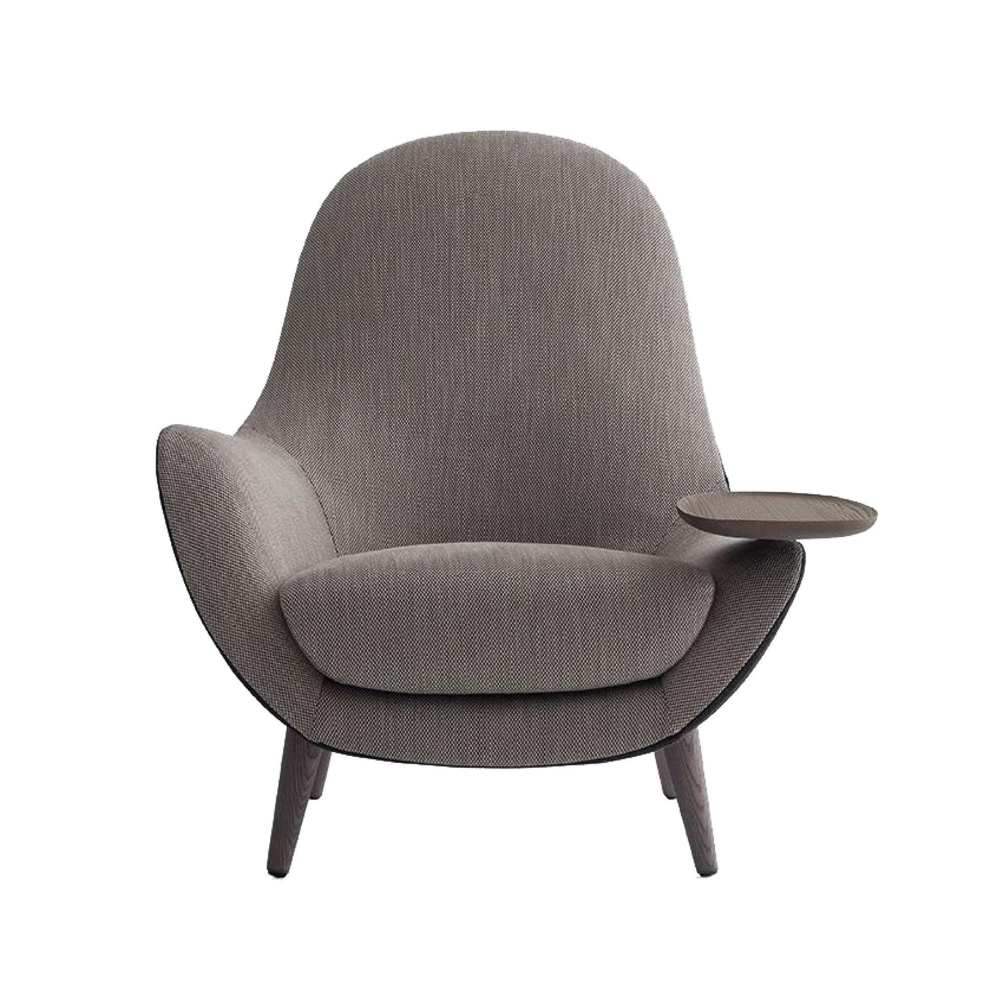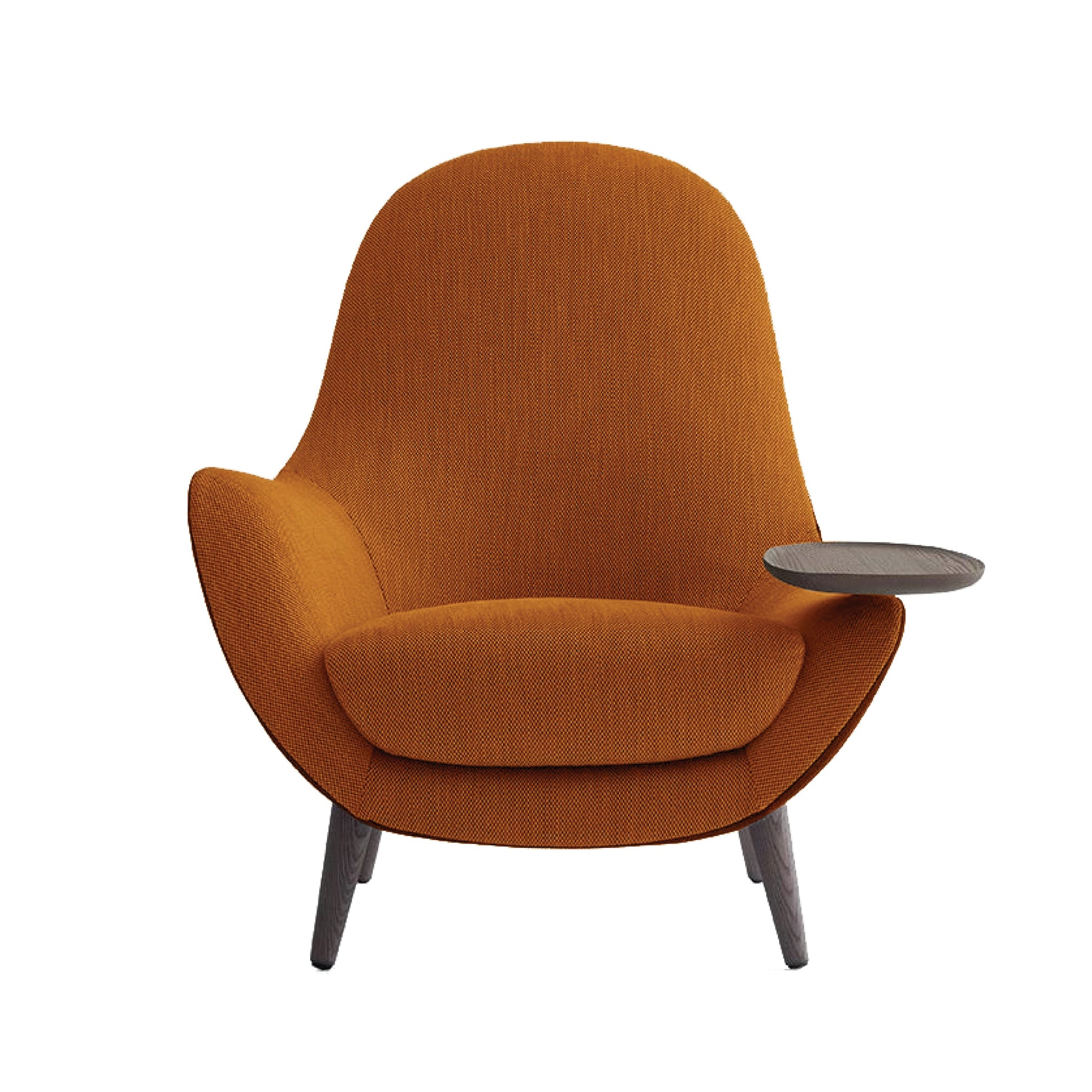 Chair arm is featured with a fine and useful wooden tray. The legs are available in different stained wood color for complete uniformity with the seat.